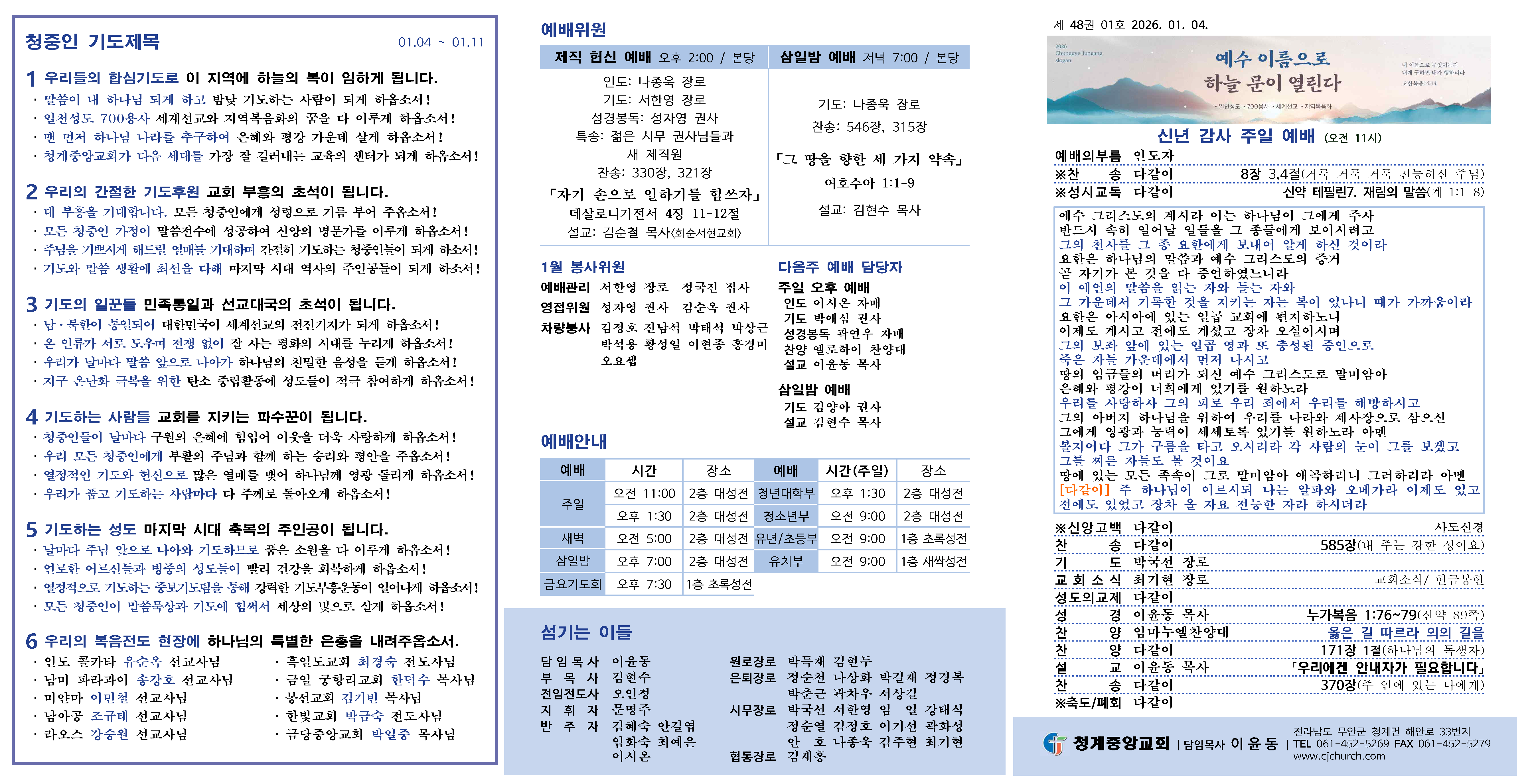 | 이전글 | 2026년 1월 11일 주보 | 김현수 | 2026.01.16 | 1 | 126 |